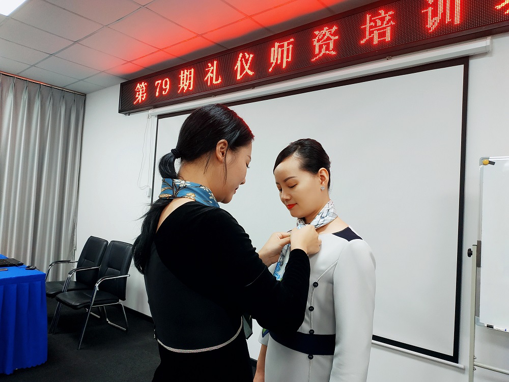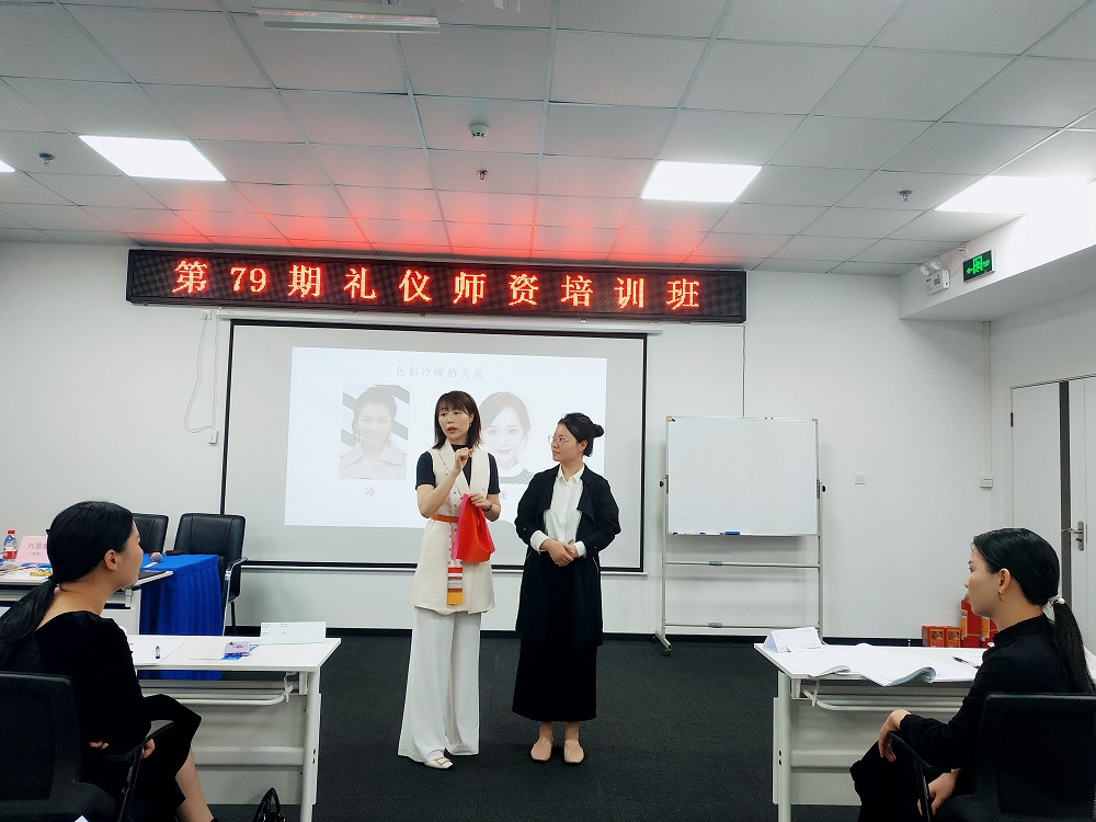 劉老師為大家講解了服裝色彩搭配等方面的理論知識,并教授學(xué)員如何根據(jù)自己的膚色來選擇適合自己的服裝、如何根據(jù)體形進行搭配服裝、如何靈活運用絲巾搭配來打造職業(yè)禮儀培訓(xùn)師的專業(yè)形象。