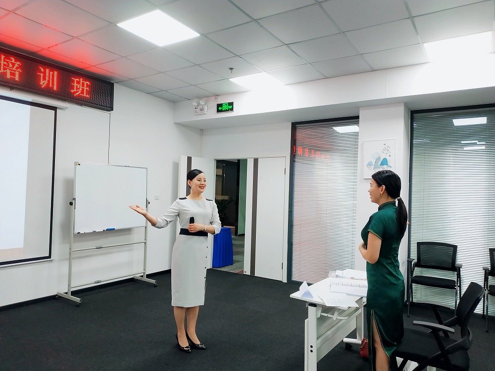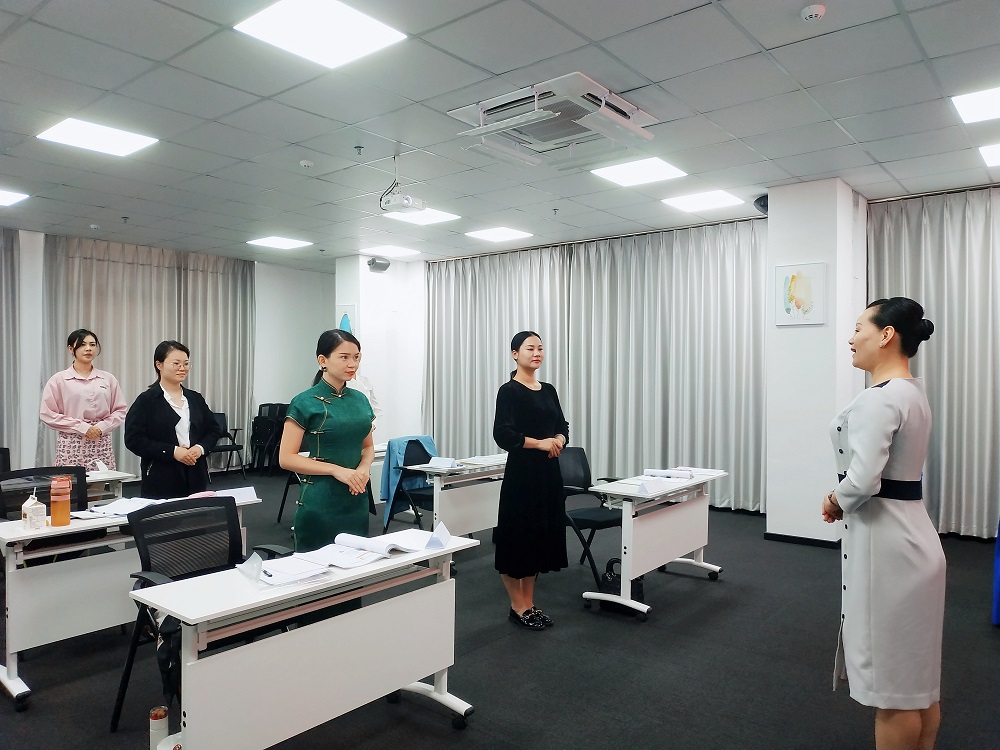 宣誓結(jié)束后,時淑妍老師給大家講授了《禮儀應(yīng)用基礎(chǔ)梳理》課程。時老師為學(xué)員們講授了禮儀培訓(xùn)師的形象塑造,并系統(tǒng)梳理了四大類的禮儀知識。課程學(xué)習(xí)中,為了促進學(xué)員相互認識,鍛煉學(xué)員與人溝通的能力,和展現(xiàn)自我的勇氣,時淑妍老師運用破冰互動讓大家在交流中加深對彼此的了解。