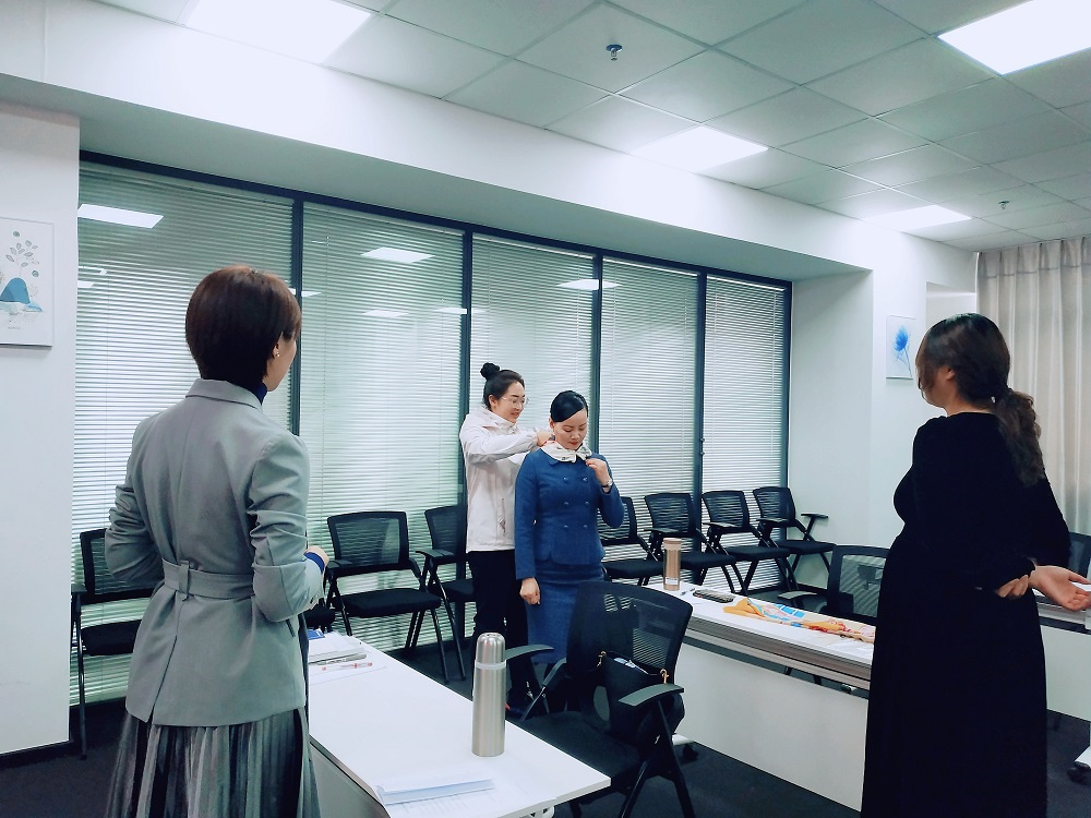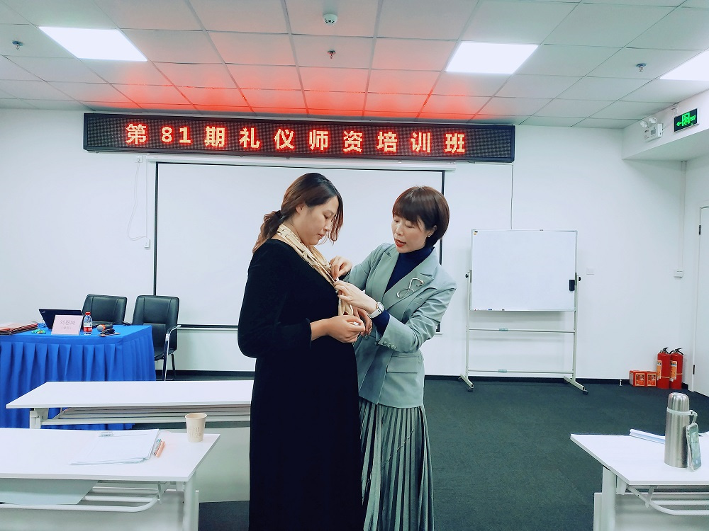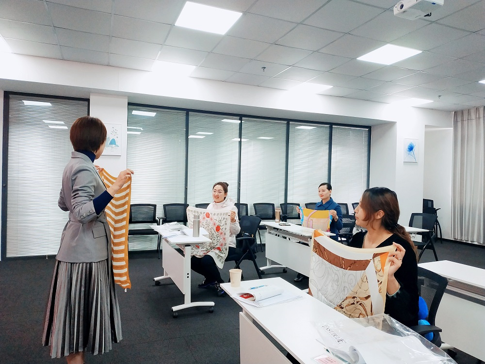 劉老師為大家講解了服裝色彩搭配等方面的理論知識,并教授學(xué)員如何根據(jù)自己的膚色來選擇適合自己的服裝、如何根據(jù)體形進(jìn)行搭配服裝、如何靈活運用絲巾搭配來打造職業(yè)禮儀培訓(xùn)師的專業(yè)形象。