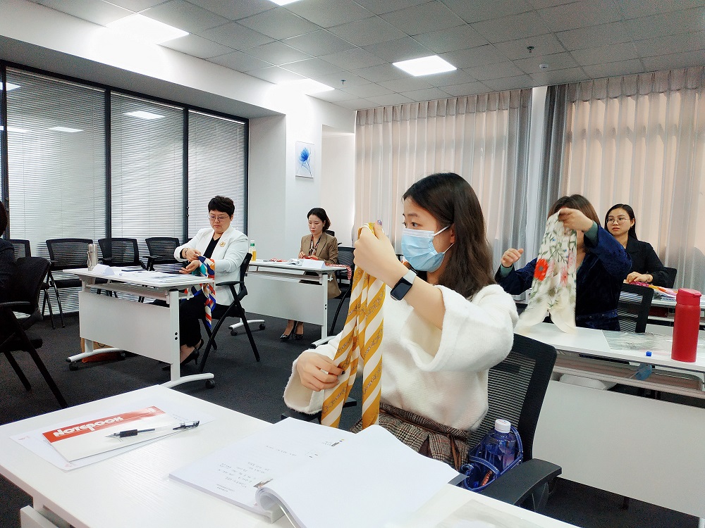 劉老師為大家講解了服裝色彩搭配等方面的理論知識(shí),并教授學(xué)員如何根據(jù)自己的膚色來(lái)選擇適合自己的服裝、如何根據(jù)體形進(jìn)行搭配服裝、如何靈活運(yùn)用絲巾搭配來(lái)打造職業(yè)禮儀培訓(xùn)師的專業(yè)形象。