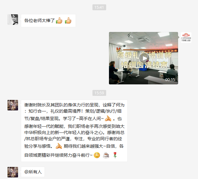 雖然本期師資培訓(xùn)學(xué)習(xí)已經(jīng)結(jié)束,但是相信各位學(xué)員通過(guò)本期禮儀師資培訓(xùn)學(xué)習(xí),不僅收獲了實(shí)用、實(shí)際、實(shí)效的禮儀教學(xué)方式與方法,也收獲了滿滿的友誼!相信本期禮儀培訓(xùn)師都能夠在今后的禮儀培訓(xùn)教學(xué)中學(xué)以致用,將專業(yè)化的知識(shí)體系傳授給更多的學(xué)員,為傳承、弘揚(yáng)、發(fā)展禮儀文化做出自己的貢獻(xiàn)!