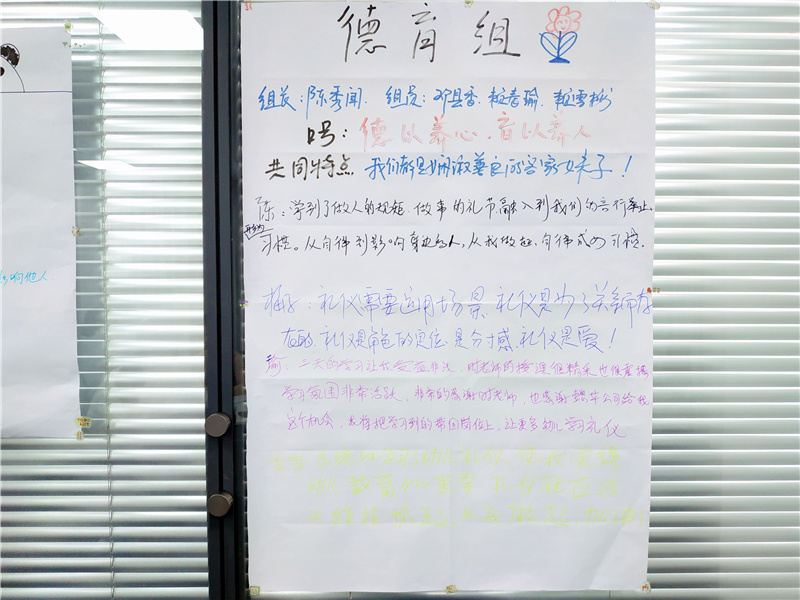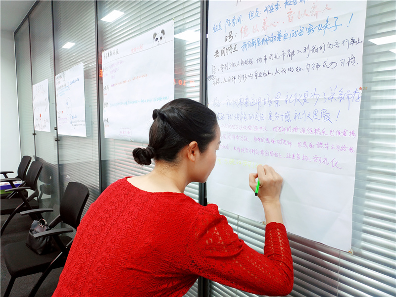 當(dāng)天下午,時老師帶領(lǐng)大家觀看幼兒禮儀素質(zhì)養(yǎng)成教育示范課,就幼兒禮儀素質(zhì)課程如何進行開課禮、課程導(dǎo)入、課程主體、解決問題、效果呈現(xiàn)、結(jié)課禮進行講解。