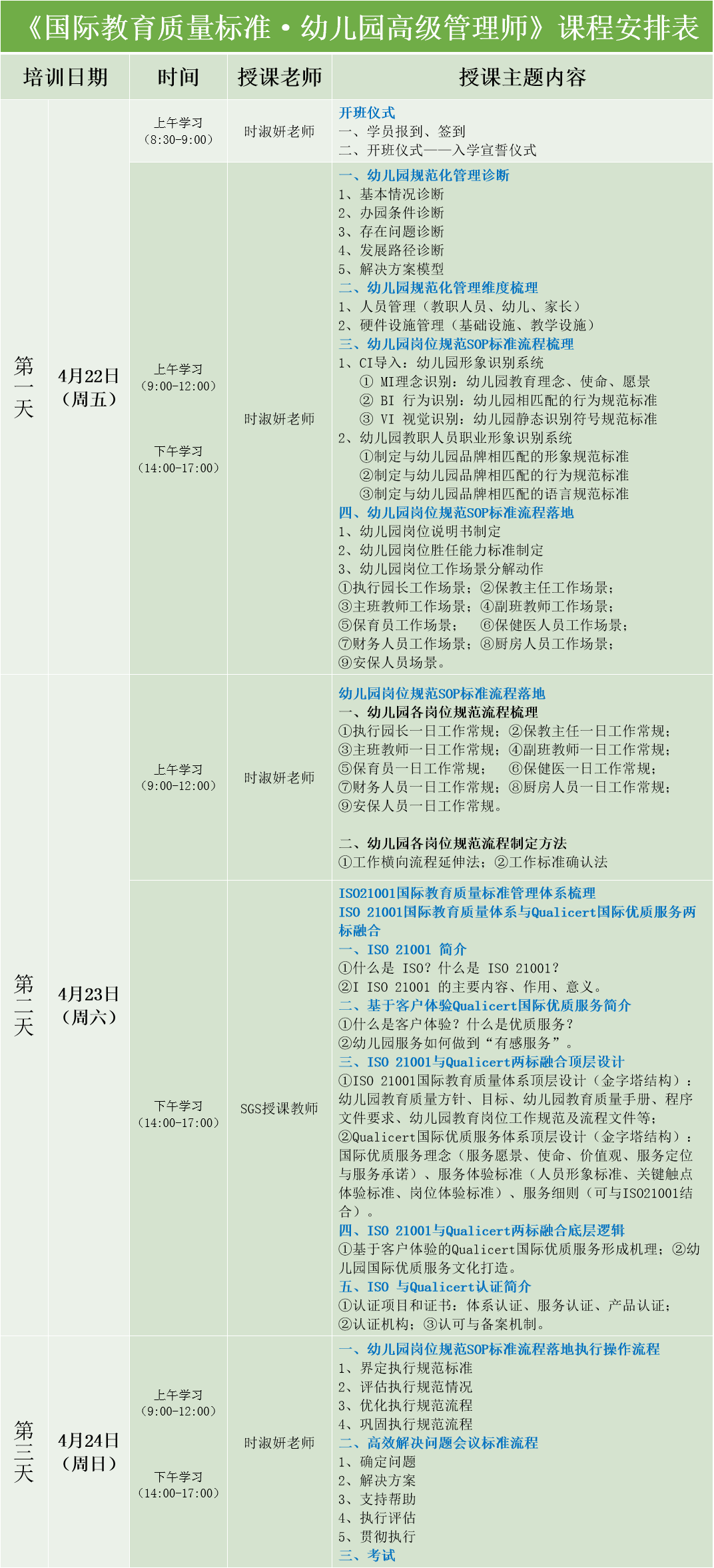 為培養(yǎng)幼兒園高素質(zhì)管理人才,提升幼兒園科學(xué)、規(guī)范、高效管理工作,根據(jù)國際標(biāo)準(zhǔn)ISO 21001《教育組織管理體系—要求及使用指南》,結(jié)合《幼兒園崗位規(guī)范行為SOP標(biāo)準(zhǔn)流程管理體系》,通過系統(tǒng)化的教職工培養(yǎng)、規(guī)范化的工作流程,可視化的管理成果,把常規(guī)管理引向精細(xì)化管理,包括各項(xiàng)工作進(jìn)一步細(xì)化、量化、流程化、標(biāo)準(zhǔn)化。運(yùn)用可操作、可復(fù)制、可評估的落地執(zhí)行的工具,實(shí)現(xiàn)幼兒園國際化教育質(zhì)量管理。