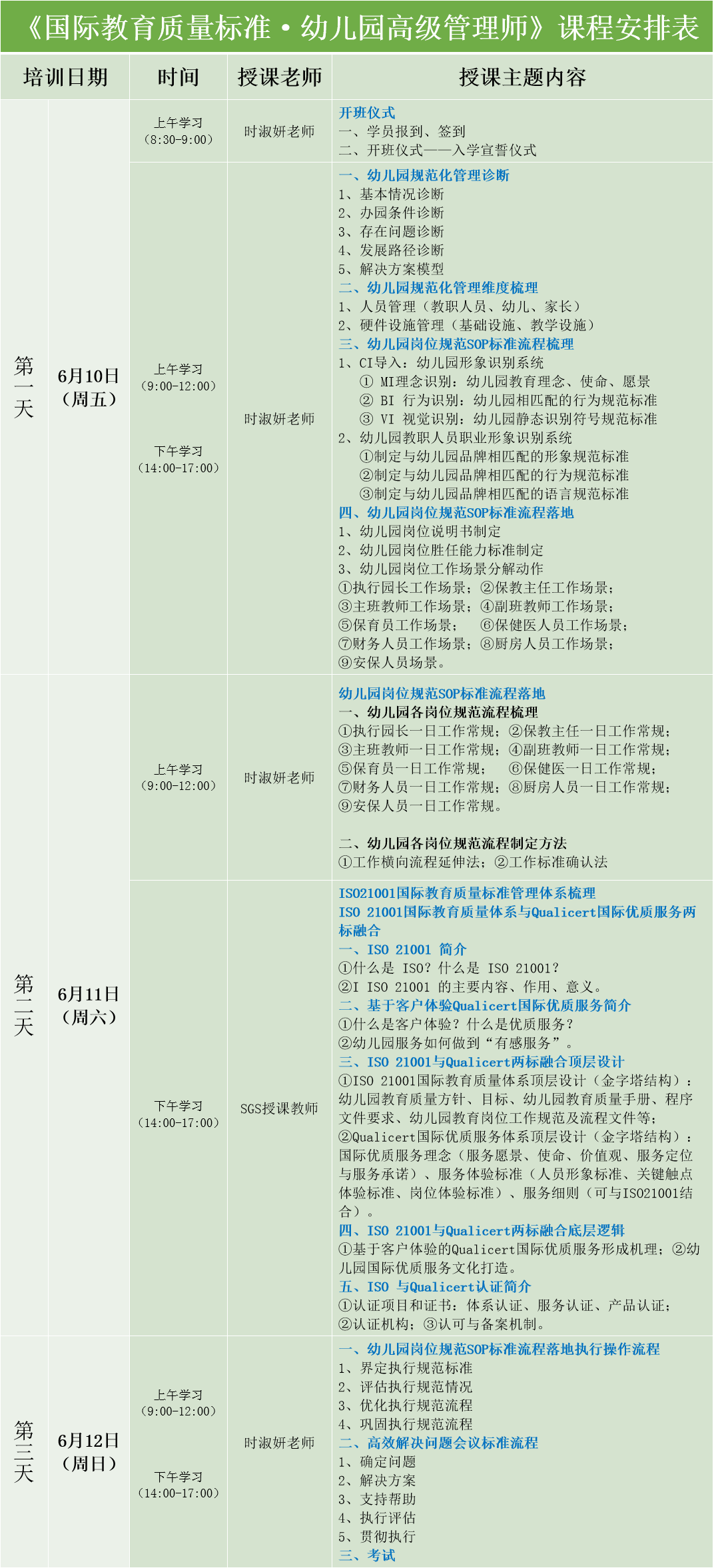 為了解決學(xué)前教育機(jī)構(gòu)管理人才培養(yǎng)、儲備的問題,幫助學(xué)前教育機(jī)構(gòu)管理工作體系化、流程化、標(biāo)準(zhǔn)化、專業(yè)化與國際接軌,廣州市禮儀協(xié)會、廣州市德禮教育將于2022年6月10日—12日在廣州開展《國際教育質(zhì)量標(biāo)準(zhǔn)化·幼兒園高級管理師》培訓(xùn)班。詳情如下: