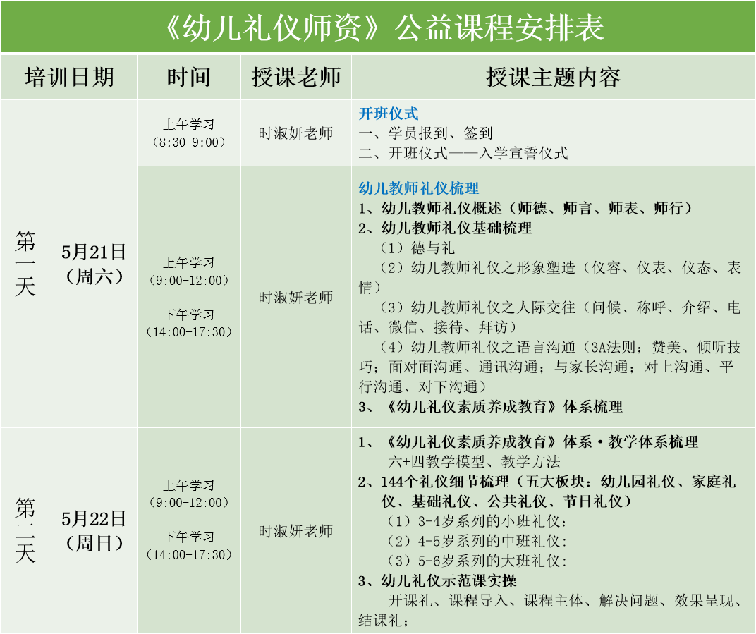 禮儀作為內(nèi)在的品德、品質(zhì)、修養(yǎng)的承載體和言行舉止、待人接物、與人交往溝通具體行為表達(dá),是成長(zhǎng)至關(guān)重要的素質(zhì),也是好家風(fēng)家教的成果展現(xiàn),更是社會(huì)文明程度的體現(xiàn)。為了解決幼兒禮儀培訓(xùn)師資緊張的問題,幫助幼兒禮儀教育工作者掌握禮儀訓(xùn)練內(nèi)容和教學(xué)規(guī)范、增強(qiáng)實(shí)際應(yīng)用授課能力、提高師資水平,建立幼兒禮儀授課專業(yè)教師隊(duì)伍,增強(qiáng)禮儀實(shí)際應(yīng)用及教育成果轉(zhuǎn)化,廣州市禮儀協(xié)會(huì)、廣州市德禮教育將于2022年5月21日—22日在廣州開展《幼兒禮儀培訓(xùn)師》公益培養(yǎng)計(jì)劃。詳情如下: